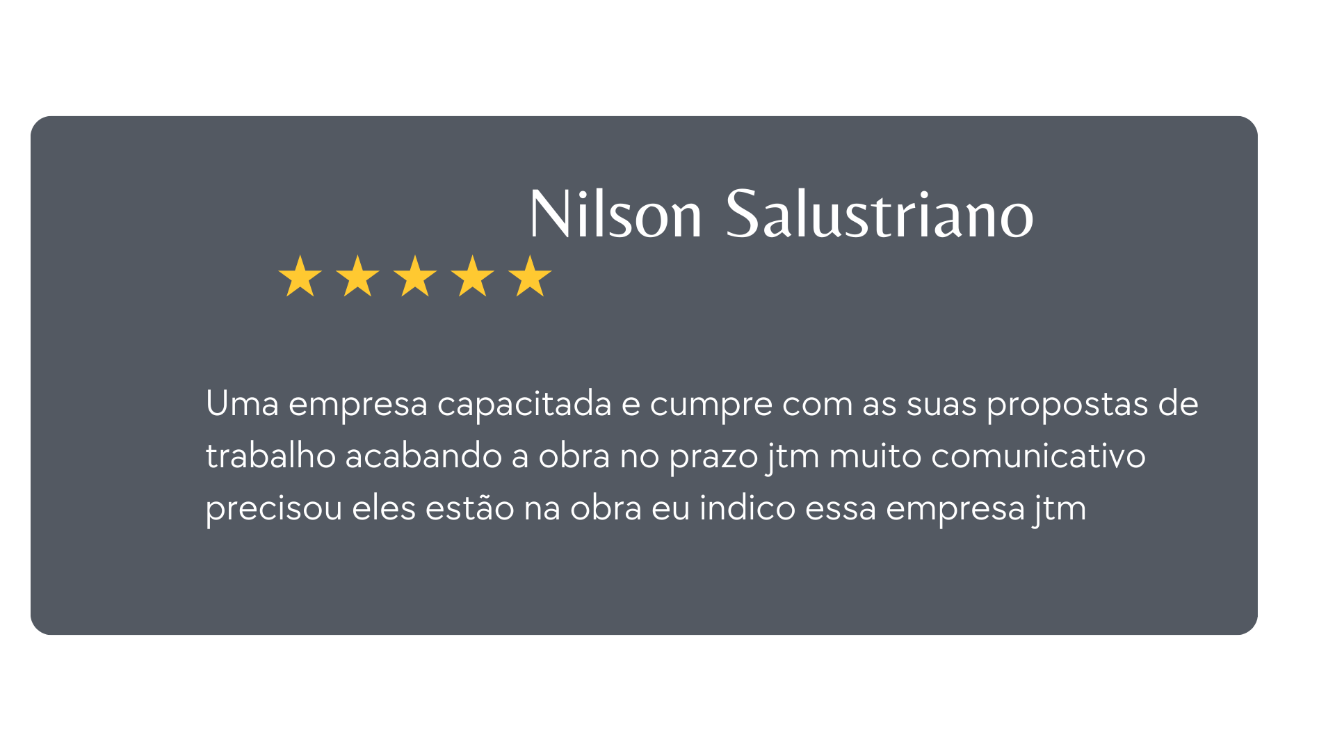 Publicado em Conceição MarquesTrustindex verifica se a fonte original da avaliação é Google. Ótimo muito bem feitoPublicado em Pr. Letildo VieiraTrustindex verifica se a fonte original da avaliação é Google. Uma Empresa com profissional espetacular, o seus serviços são de primeira qualidade.Publicado em Jairo Correia da SilvaTrustindex verifica se a fonte original da avaliação é Google. Uma empresa que presta um excelente serviço.Publicado em M. felix SantosTrustindex verifica se a fonte original da avaliação é Google. Empresa com ótimos profissionais serviços de qualidade e garantia recomendo demaisPublicado em Mais Delivery Rio ClaroTrustindex verifica se a fonte original da avaliação é Google. O Melhor serviço, muito profissional e qualificado.Publicado em nilson salustrianoTrustindex verifica se a fonte original da avaliação é Google. Uma empresa capacitada e cumpre com as suas propostas de trabalho acabando a obra no prazo jtm muito comunicativo precisou eles estão na obra eu indico essa empresa jtmPublicado em Augusto ProchnonTrustindex verifica se a fonte original da avaliação é Google. Trabalho correto , eficiente e honesto ! Recomendo 👏👏👏Publicado em Emerson MartinsTrustindex verifica se a fonte original da avaliação é Google. Foi muito bomPublicado em Gabriel AlmeidaTrustindex verifica se a fonte original da avaliação é Google. Empresa extremamente profissional e competente em instalações elétricas e hidráulicas. O serviço foi executado com muita qualidade, organização e atenção aos detalhes. Os proprietários são pessoas de total confiança, honestas e muito corretas, o que transmite muita segurança. Dá pra perceber claramente o empenho e a seriedade com que conduzem cada trabalho. A empresa atende todos os serviços com alto padrão de qualidade, segurança e comprometimento, cumprindo prazos e mantendo o local sempre organizado. O resultado final superou as expectativas. Recomendo fortemente para quem busca qualidade, confiança e profissionalismo.